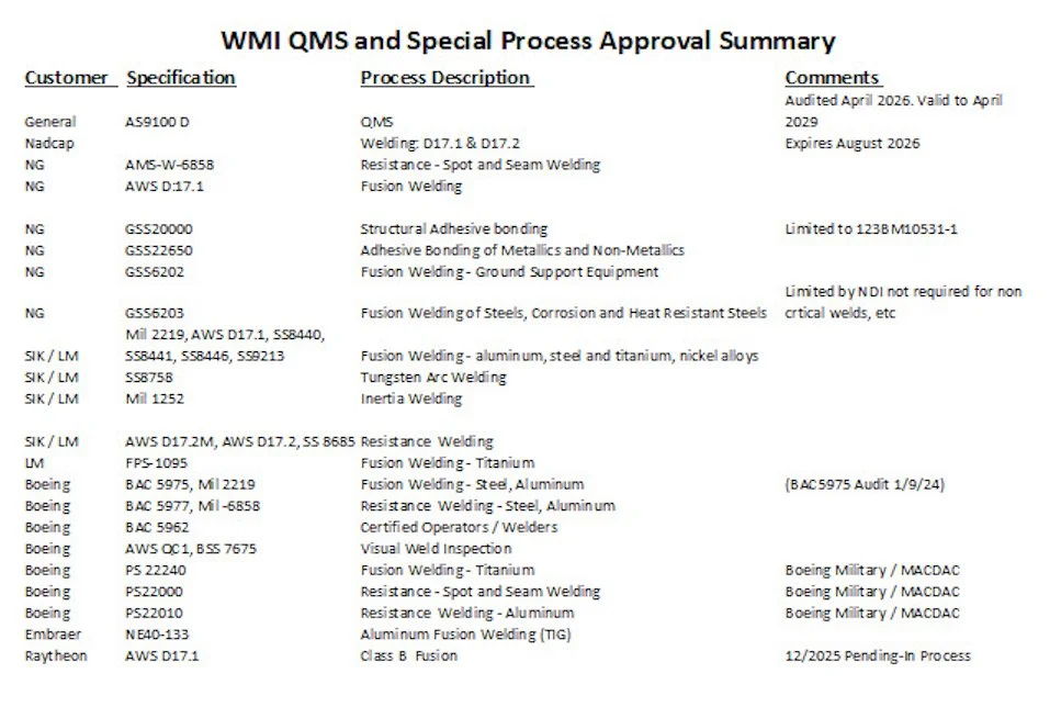 Welding Metallurgy (WMI) is a provider of metallurgical engineering and welding services and a manufacturer of components for various sub-sectors of the military and commercial aerospace industries. In December 2018, WMI was acquired by CPI Aero. The addition of WMI provides CPI Aero the opportunity to provide customers with an even more comprehensive portfolio of products and services. WMI will continue to provide its specialty products, services, and engineering expertise as a wholly owned subsidiary of CPI Aero.
